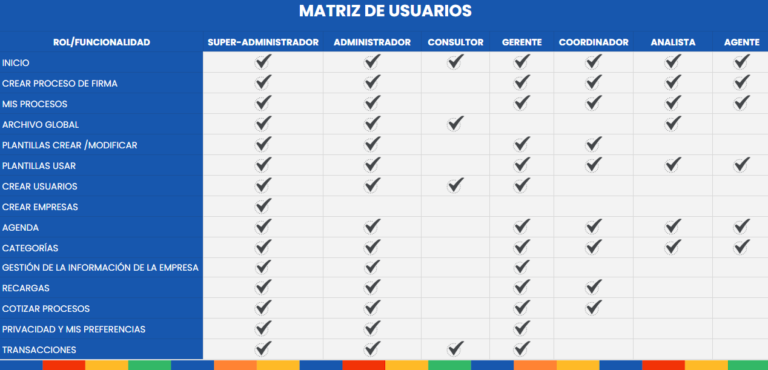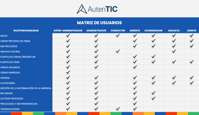 ¡Hola! En este blog te contamos cómo cada usuario de tu compañía tiene un rol específico con permisos definidos para garantizar un uso eficiente y seguro de nuestra plataforma de firma electrónica. Acá te explicamos de manera sencilla qué puede hacer cada rol y qué permisos tiene dentro de AutenTIC Sign. Así, podrás asignar los permisos adecuados a tus colaboradores, asegurando un mejor control y administración de los procesos. En la siguiente tabla puedes visualizar los permisos a los que puede acceder cada rol: