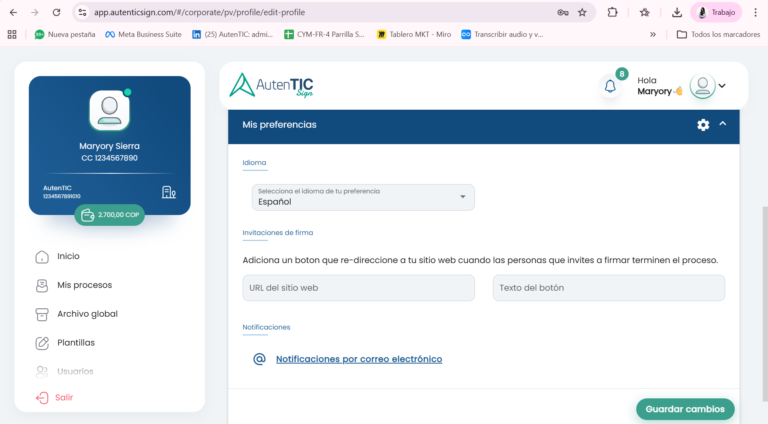 En esta opción, está la posibilidad de modificar la contraseña, y de seleccionar si se desea o no recibir notificaciones al correo, es decir, se pueden desactivar las notificaciones que se envían al correo electrónico, esto sin afectar cuando se seleccione el método de autenticación con OTP que llega al correo el código de 4 dígitos.