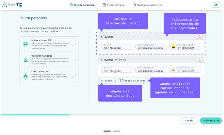 Diligenciar la información de tus invitados.