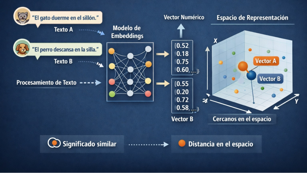 • Significado por cercanía: Cuanto más cerca están los vectores en ese espacio, más parecido es su significado para la IA. Por ejemplo, “perro” y “gato” estarán geográficamente cerca en ese mapa matemático.
