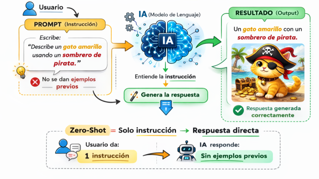 • Zero shot prompting: Es dar una instrucción directa sin ejemplos previos. Funciona para tareas estándar donde el formato de salida es obvio.
