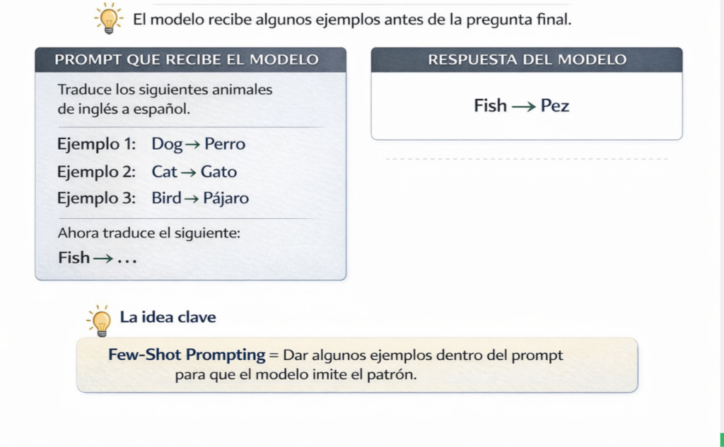 • Few shot prompting: Es el hack definitivo para automatizar. Consiste en darle al modelo varios ejemplos de “Entrada → Salida” para que aprenda el patrón, estilo o tono deseado antes de procesar la información final. Esto permite que la IA generalice y entregue resultados consistentes y alineados con tus expectativas reales.