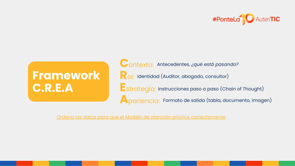 Para estructurar prompts profesionales, utiliza el framework C.R.E.A.: