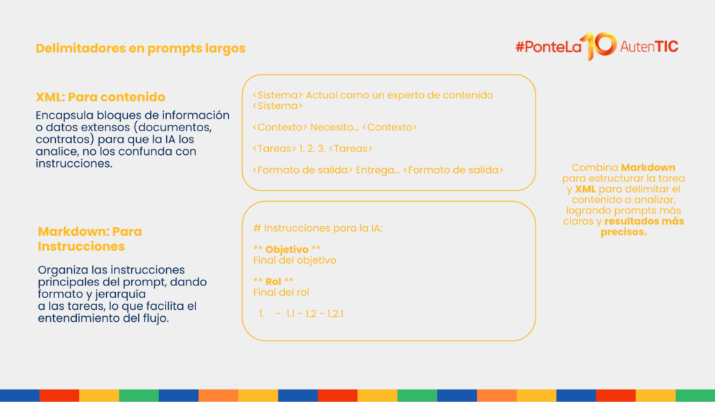 • Delimitadores: En prompts largos, la IA puede confundir tus instrucciones con el contenido del documento (contaminación de contexto). Usa etiquetas XML (como <Tarea> o <Documento>) para encapsular la información y separar claramente las órdenes de los datos.